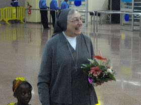 20 February a warm welcome is reserved for Mother Yvonne at the Yaounde International Airport Nsimalen. Reception continues at home with some young come for the circumstances ... Songs and symbols express the joy ...
